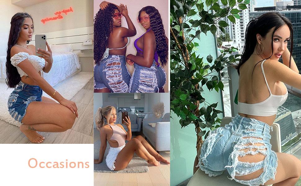 Material:High quality Deinm Fabric with high stretchy, thick but super soft, perfect for this form fitting shorts.